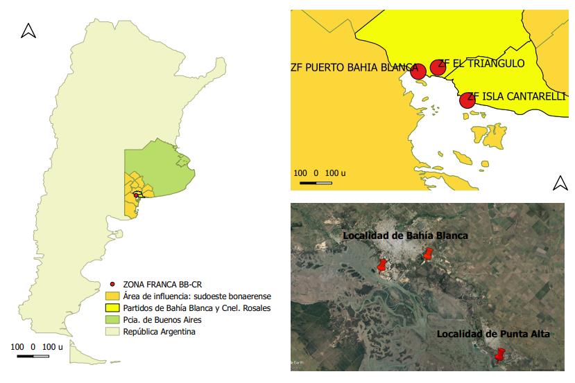 La Zona Franca Bahía Blanca-Coronel Rosales se encuentra geográficamente desconcentrada (Figura 1). Por un lado, el Área Operativa I se localiza en la Isla Cantarelli, donde se hallan las oficinas del concesionario y la aduana. Este sector se lo definió como el área principal y está ubicado a 40 kilómetros de Bahía Blanca, entre Puerto Rosales y Punta Ancla. Dispone de 2 galpones de 1000 m2 cada uno y con una altura de almacenamiento de hasta 8 metros.